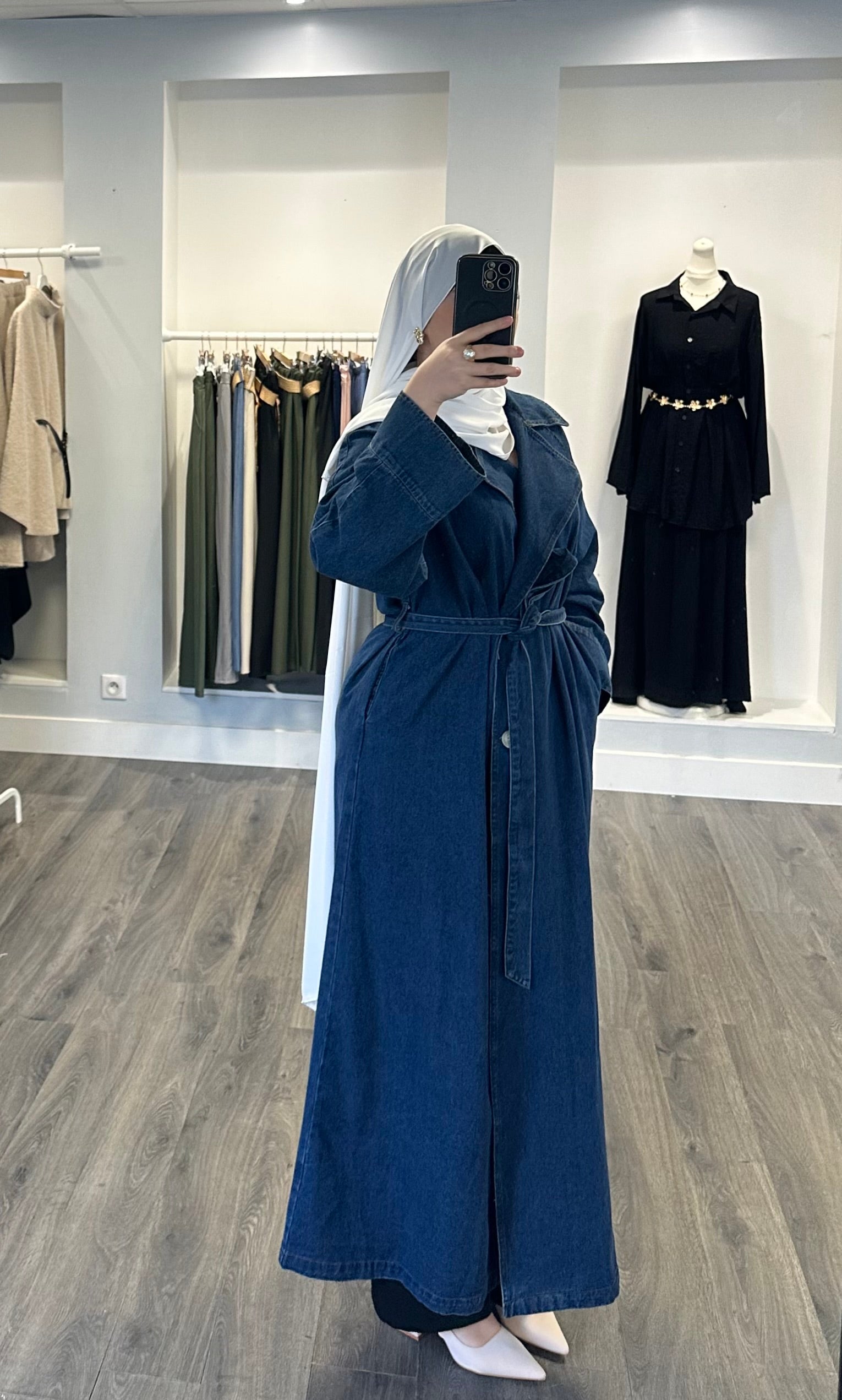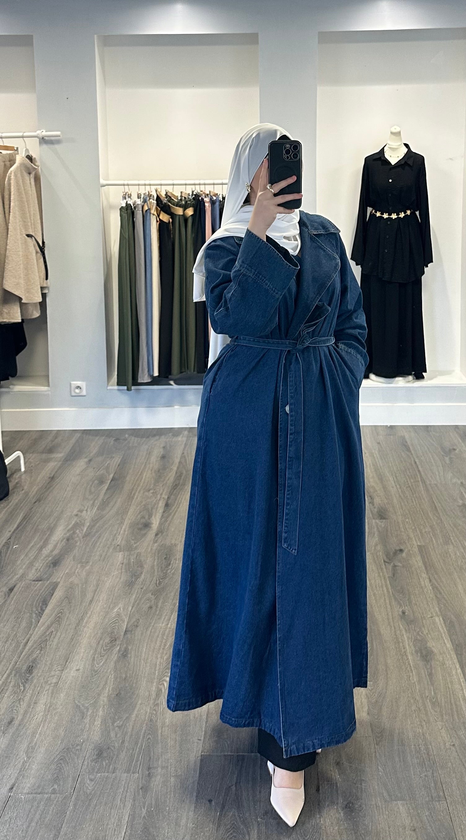 Trench long en jean à la coupe droite et ample, d’une ceinture assortie à nouer à la taille permettant d’ajuster la silhouette selon le porté